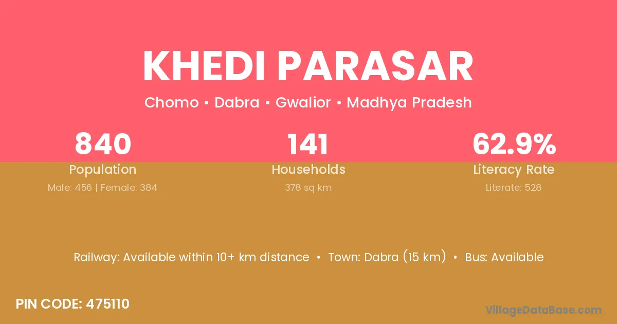 Dabra (15 km) is the nearest town to Khedi Parasar village for major economic activities and is located approximately 15 km away.