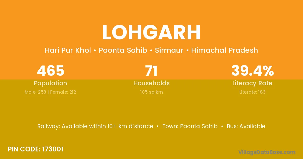 The literacy rate of Lohgarh village is 48.15%. Male literacy stands at 58.96% and female literacy at 34.93%.