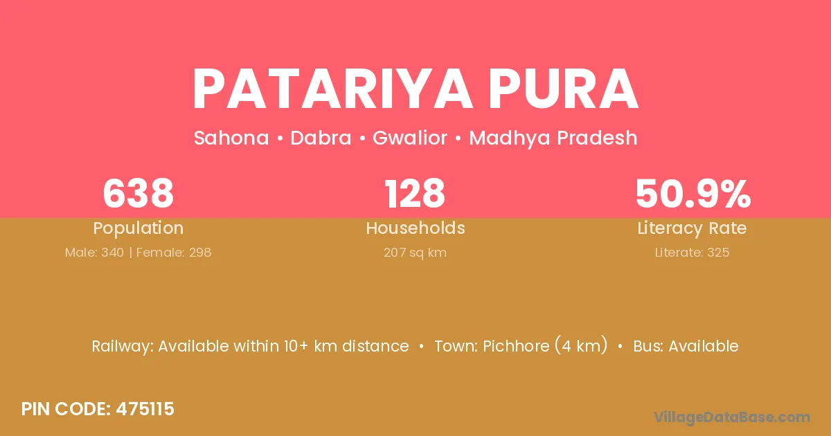 Pichhore (4 km) is the nearest town to Patariya Pura village for major economic activities and is located approximately 4 km away.