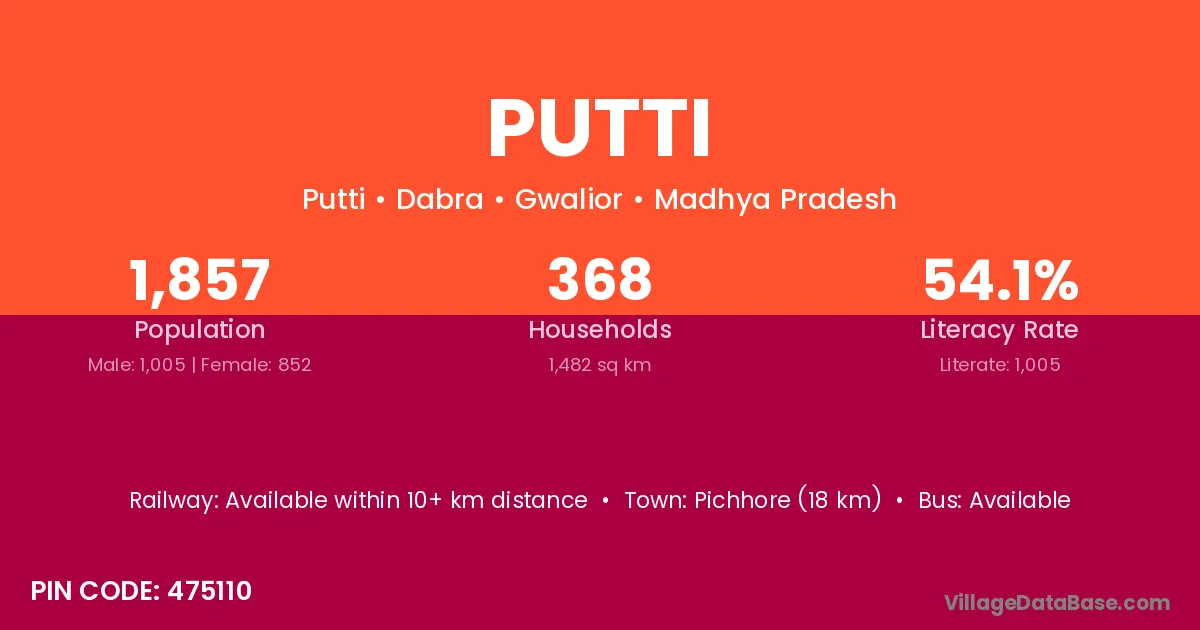 Pichhore (18 km) is the nearest town to Putti village for major economic activities and is located approximately 18 km away.