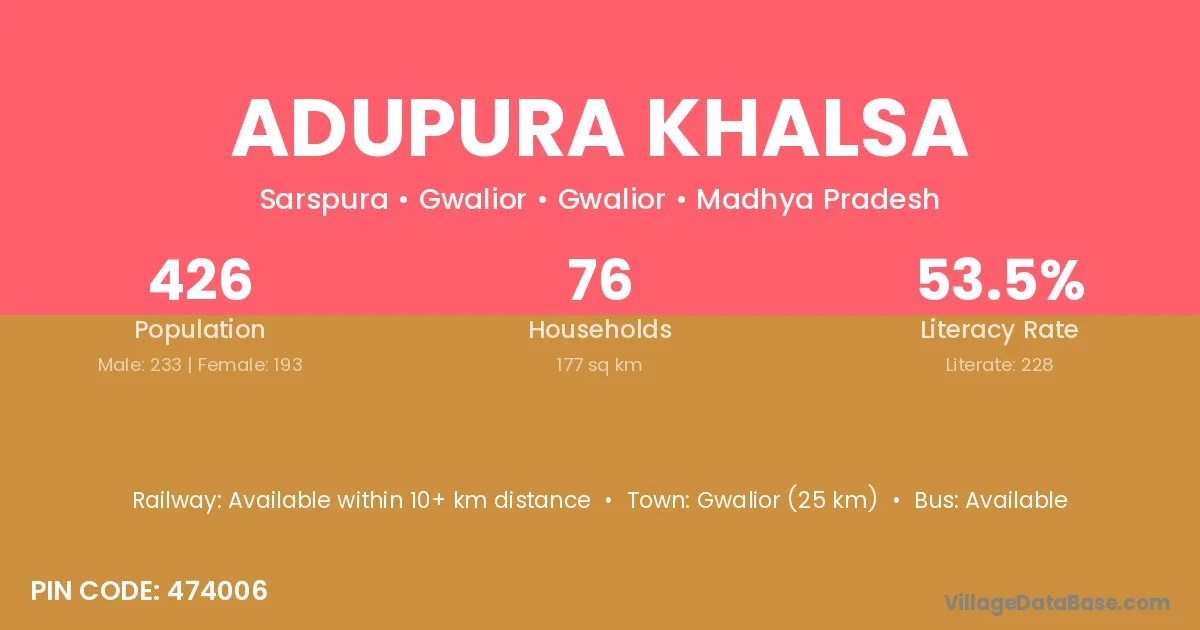 Gwalior (25 km) is the nearest town to Adupura Khalsa village for major economic activities and is located approximately 25 km away.