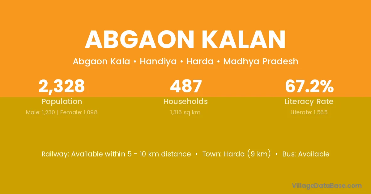 Harda (9 km) is the nearest town to Abgaon Kalan village for major economic activities and is located approximately 9 km away.