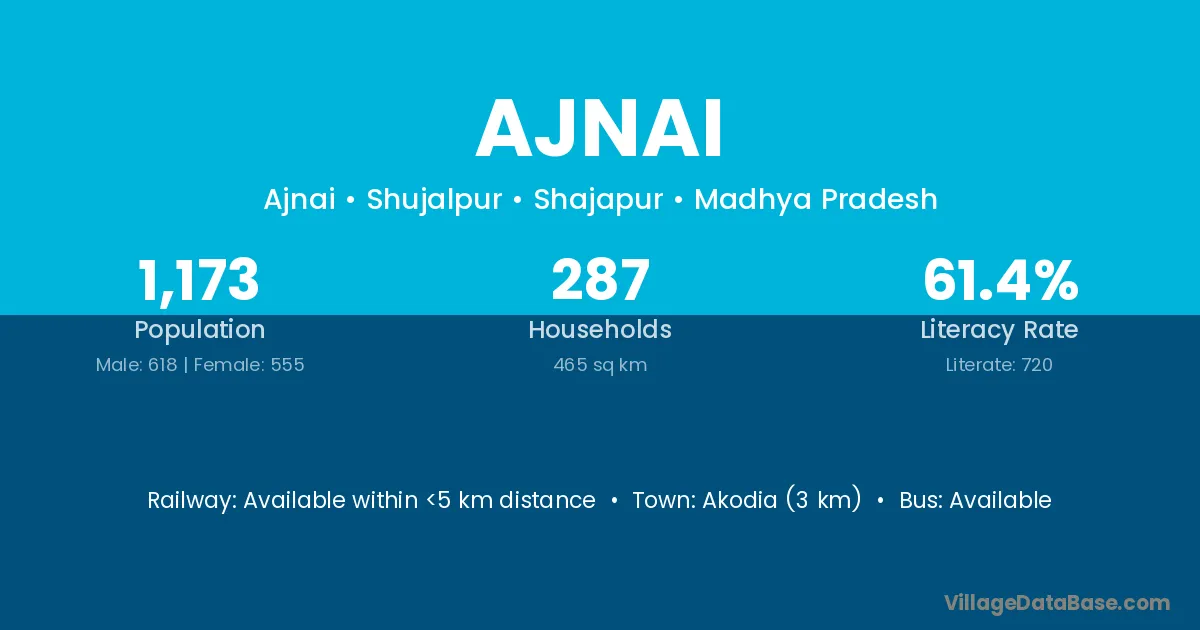 Harda (20 km) is the nearest town to Ajnai village for major economic activities and is located approximately 20 km away.