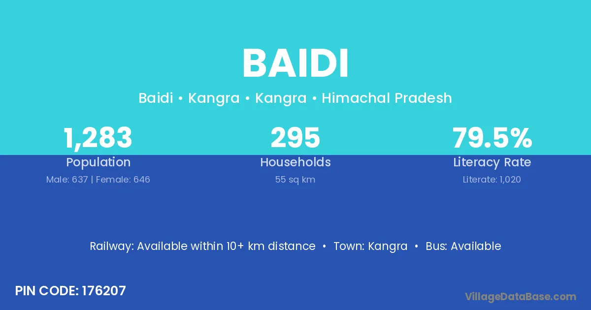 Harda (13 km) is the nearest town to Baidi village for major economic activities and is located approximately 13 km away.