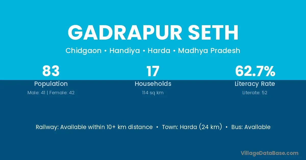 Harda (24 km) is the nearest town to Gadrapur Seth village for major economic activities and is located approximately 24 km away.