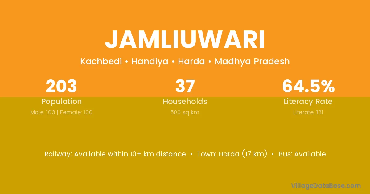 Harda (17 km) is the nearest town to Jamliuwari village for major economic activities and is located approximately 17 km away.