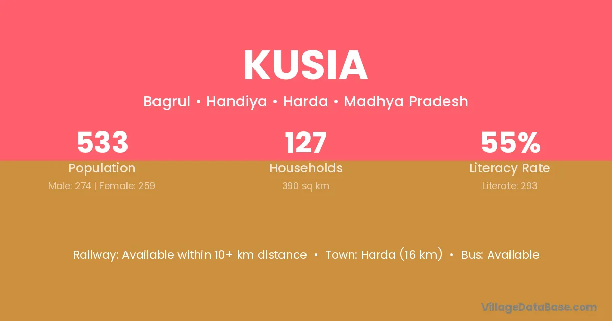 Harda (16 km) is the nearest town to Kusia village for major economic activities and is located approximately 16 km away.