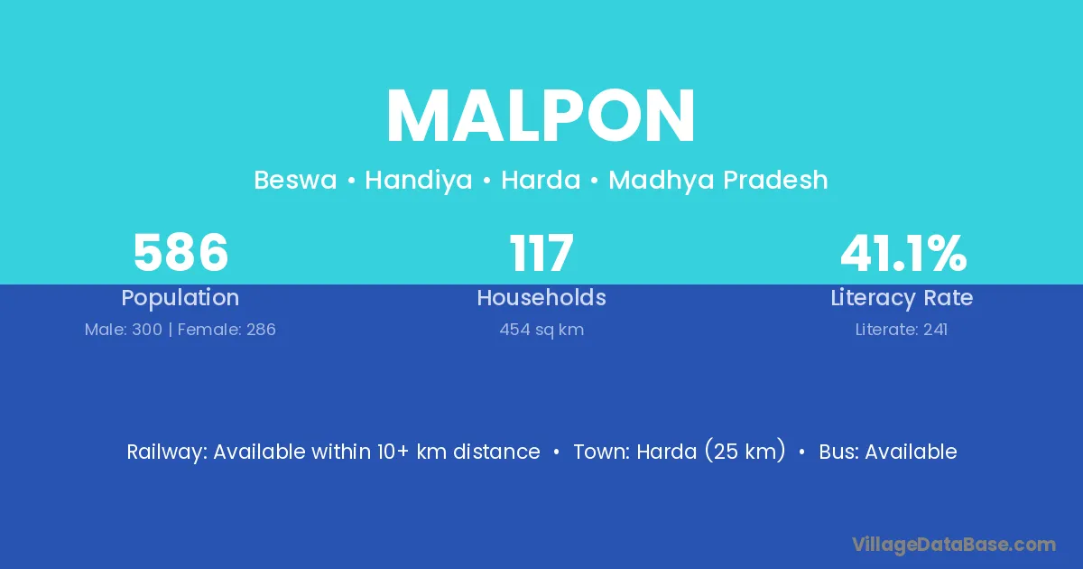 Harda (25 km) is the nearest town to Malpon village for major economic activities and is located approximately 25 km away.