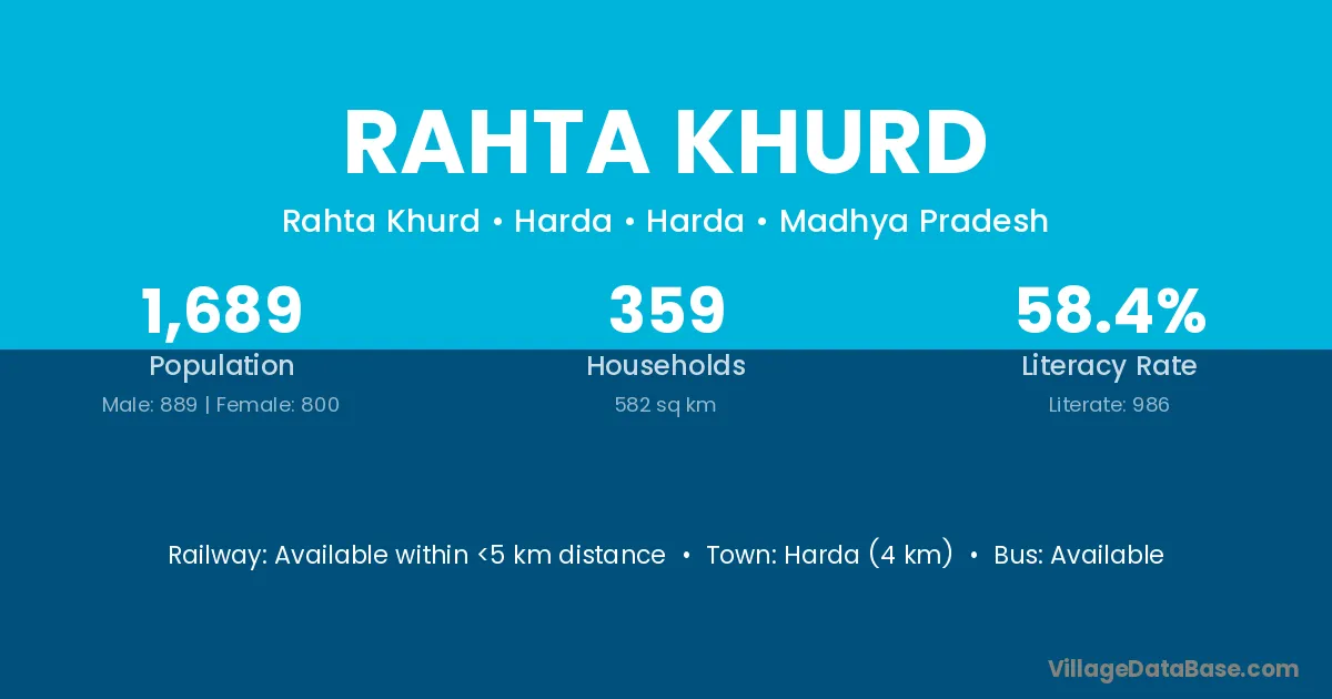 Harda (4 km) is the nearest town to Rahta Khurd village for major economic activities and is located approximately 4 km away.