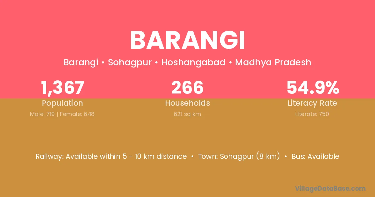 Khirkiya (17 km) is the nearest town to Barangi village for major economic activities and is located approximately 17 km away.