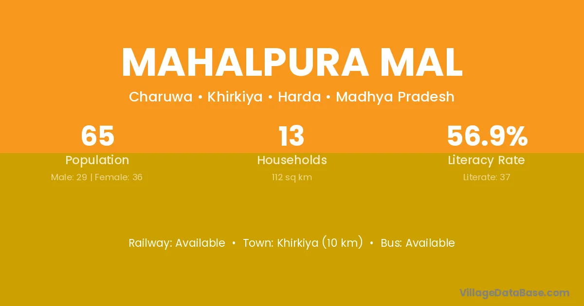 Khirkiya (10 km) is the nearest town to Mahalpura Mal village for major economic activities and is located approximately 10 km away.