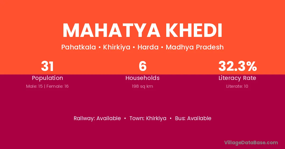 Mahatya Khedi village has a total population of 31 people, of which 15 are males and 16 are females.