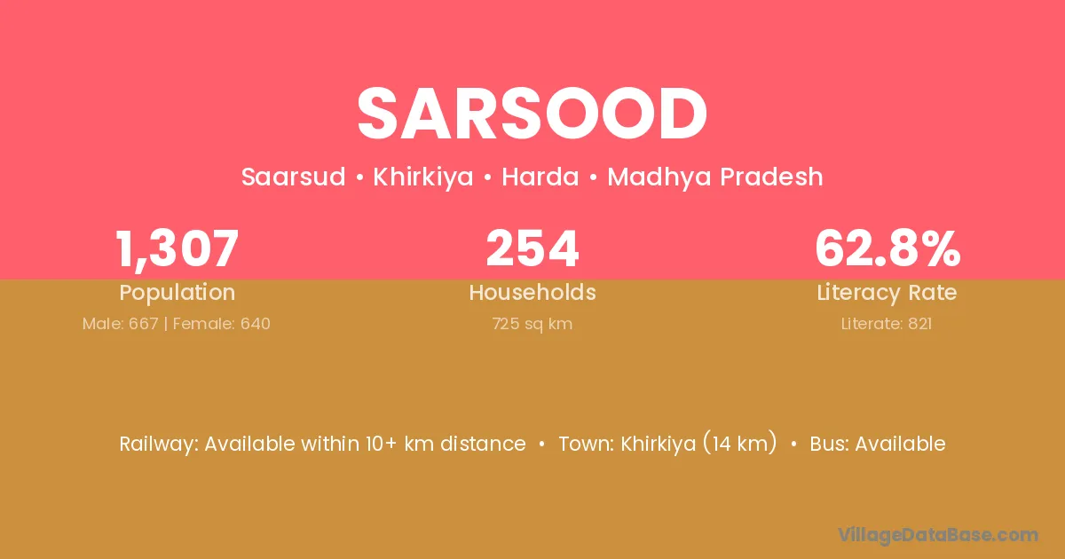 Khirkiya (14 km) is the nearest town to Sarsood village for major economic activities and is located approximately 14 km away.