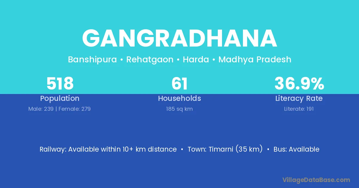 Timarni (35 km) is the nearest town to Gangradhana village for major economic activities and is located approximately 35 km away.