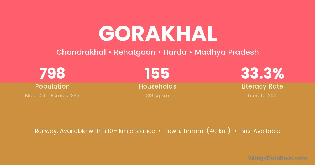Timarni (40 km) is the nearest town to Gorakhal village for major economic activities and is located approximately 40 km away.