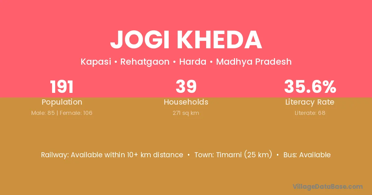 Jogi Kheda village has a total population of 191 people, of which 85 are males and 106 are females.