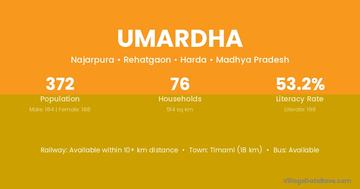Timarni (18 km) is the nearest town to Umardha village for major economic activities and is located approximately 18 km away.