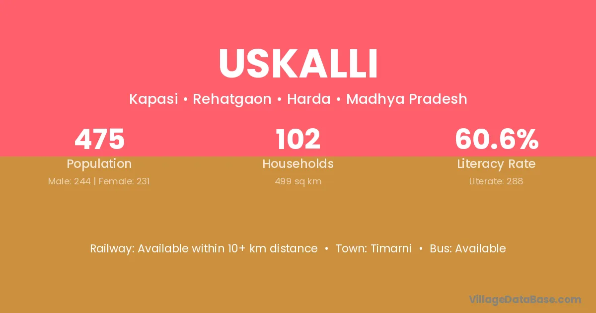 Uskalli village has a total population of 475 people, of which 244 are males and 231 are females.