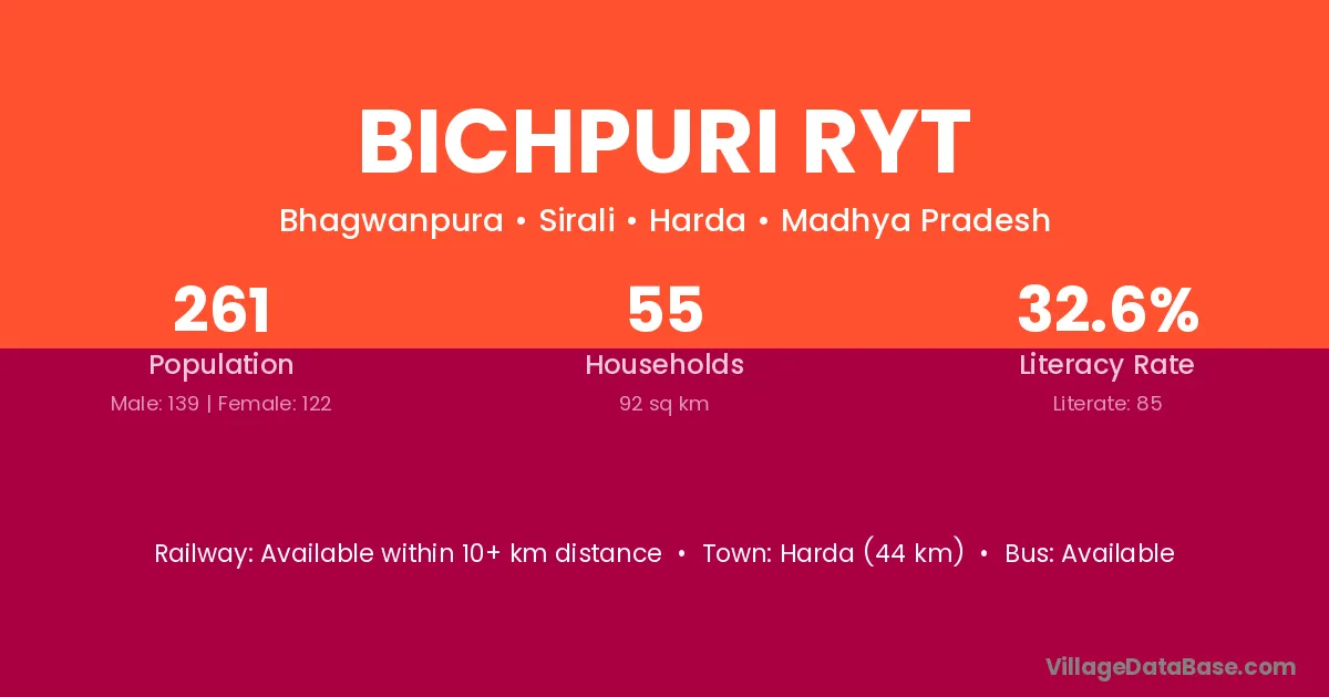Harda (44 km) is the nearest town to Bichpuri Ryt village for major economic activities and is located approximately 44 km away.
