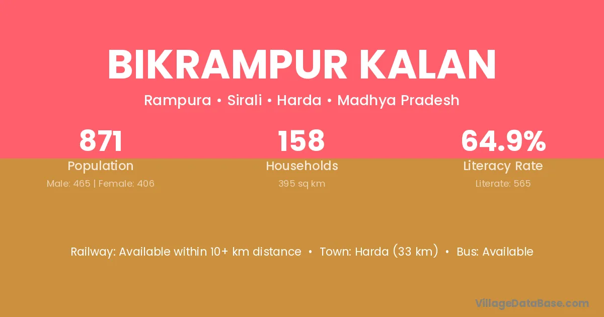 Harda (33 km) is the nearest town to Bikrampur Kalan village for major economic activities and is located approximately 33 km away.