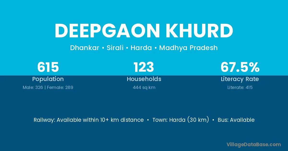 Harda (30 km) is the nearest town to Deepgaon Khurd village for major economic activities and is located approximately 30 km away.