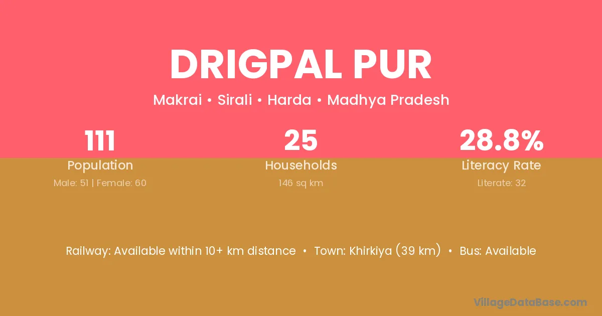Khirkiya (39 km) is the nearest town to Drigpal Pur village for major economic activities and is located approximately 39 km away.