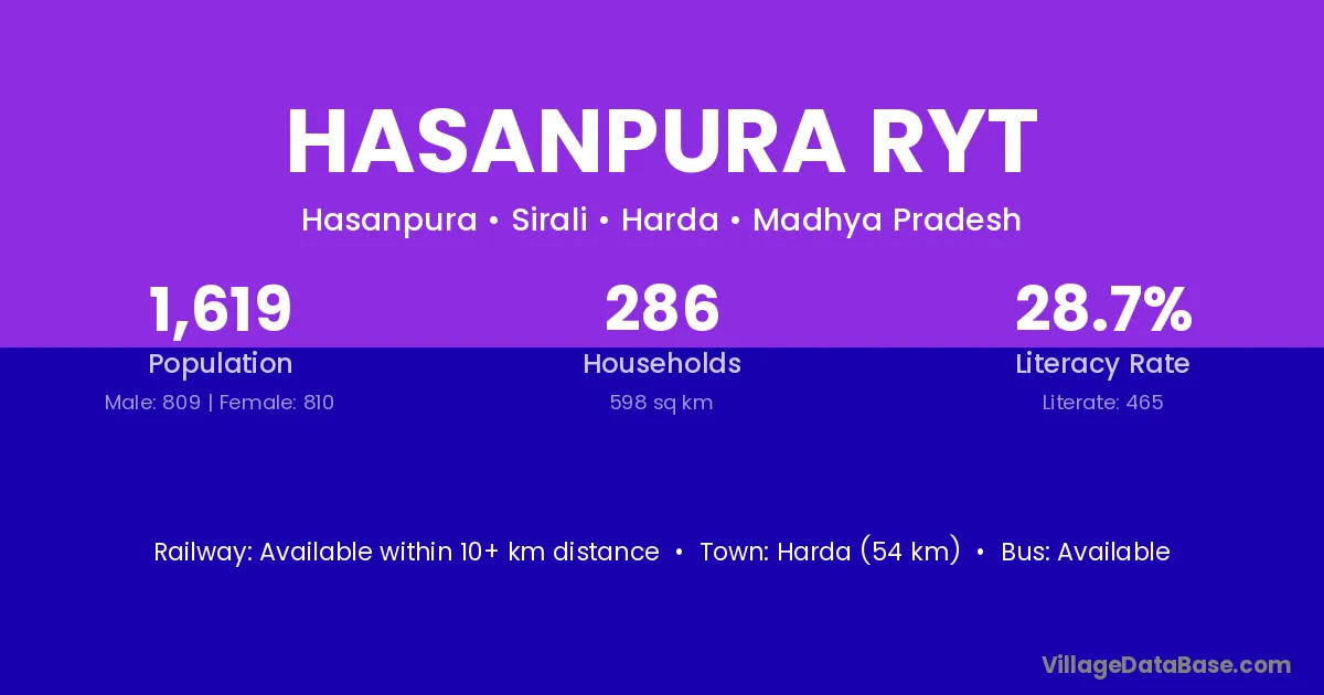 Harda (54 km) is the nearest town to Hasanpura Ryt village for major economic activities and is located approximately 54 km away.