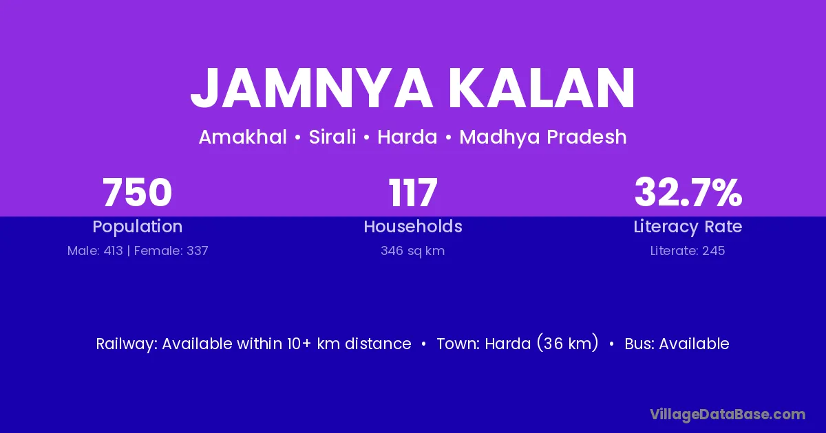Harda (36 km) is the nearest town to Jamnya Kalan village for major economic activities and is located approximately 36 km away.