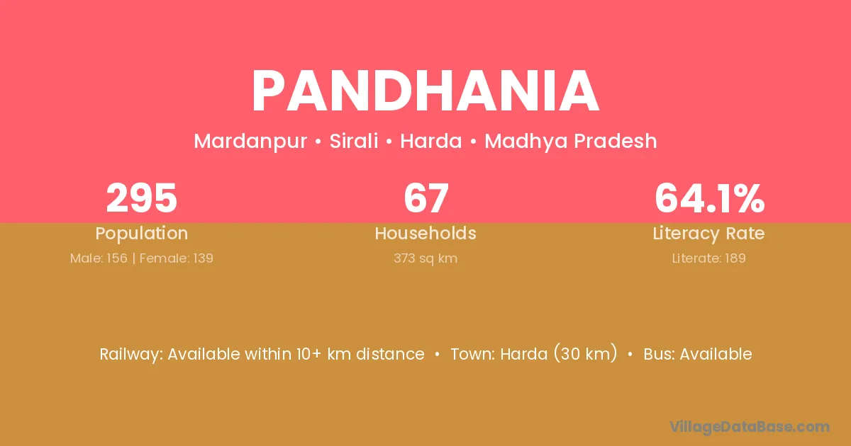 Harda (30 km) is the nearest town to Pandhania village for major economic activities and is located approximately 30 km away.
