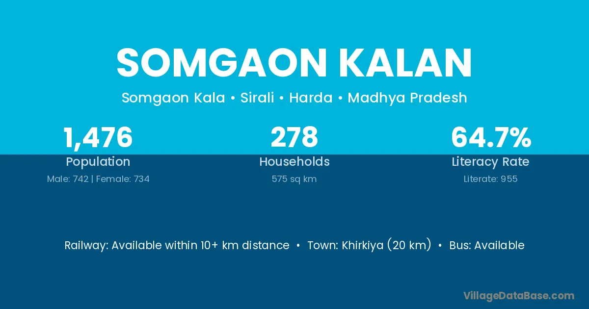 Khirkiya (20 km) is the nearest town to Somgaon Kalan village for major economic activities and is located approximately 20 km away.