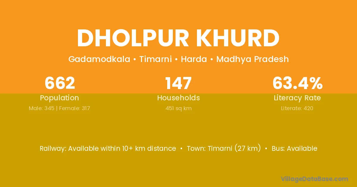Timarni (27 km) is the nearest town to Dholpur Khurd village for major economic activities and is located approximately 27 km away.