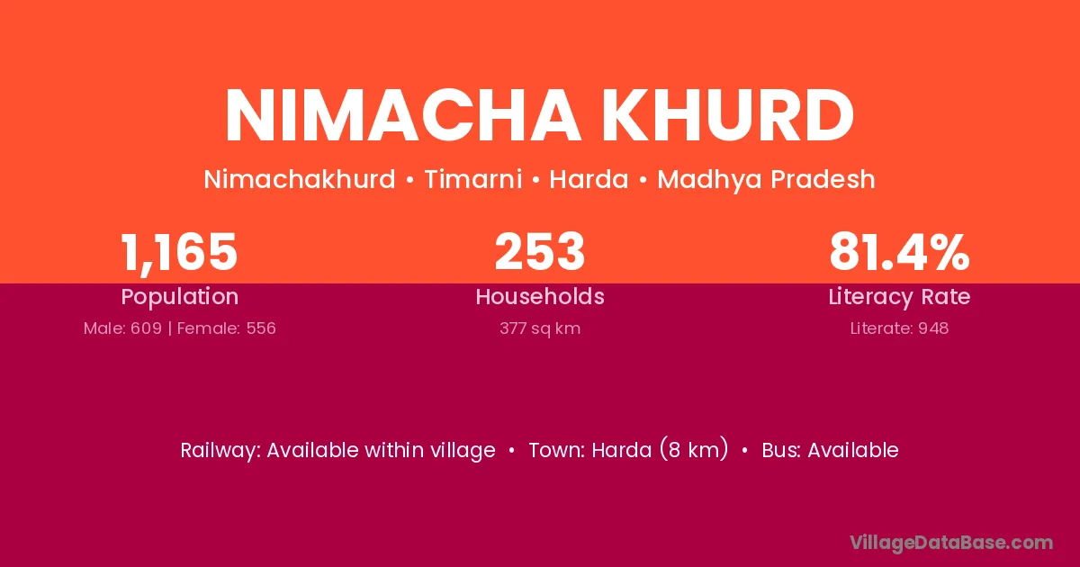 Harda (8 km) is the nearest town to Nimacha Khurd village for major economic activities and is located approximately 8 km away.