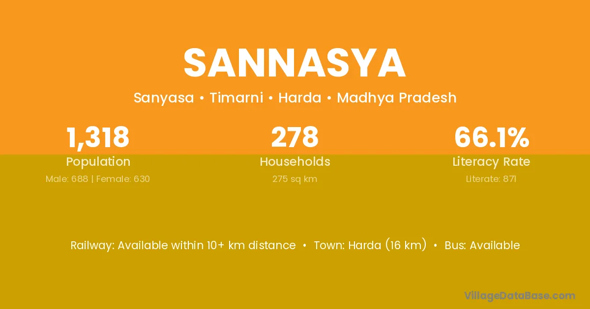 Harda (16 km) is the nearest town to Sannasya village for major economic activities and is located approximately 16 km away.