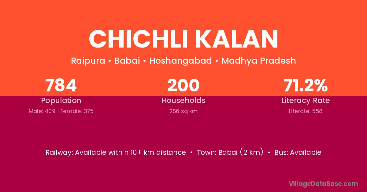 Babai (2 km) is the nearest town to Chichli Kalan village for major economic activities and is located approximately 2 km away.