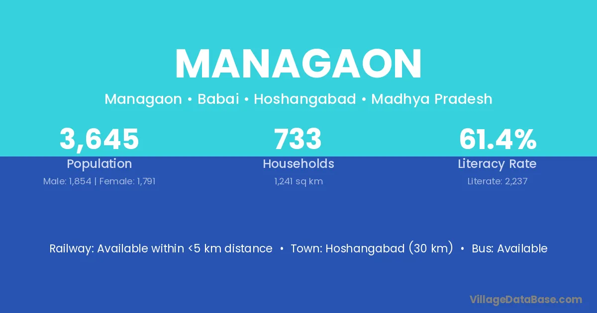Hoshangabad (30 km) is the nearest town to Managaon village for major economic activities and is located approximately 30 km away.