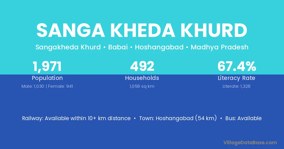 Sanga Kheda Khurd village has a total population of 1,971 people, of which 1,030 are males and 941 are females.