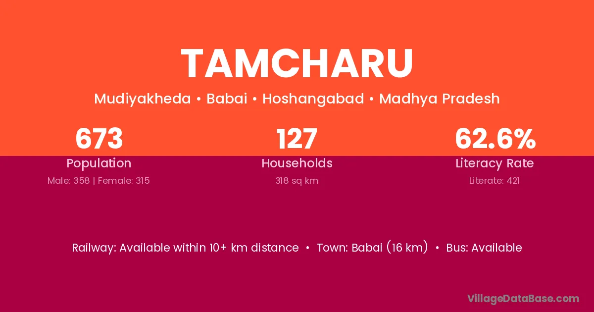 Tamcharu village has a total population of 673 people, of which 358 are males and 315 are females.