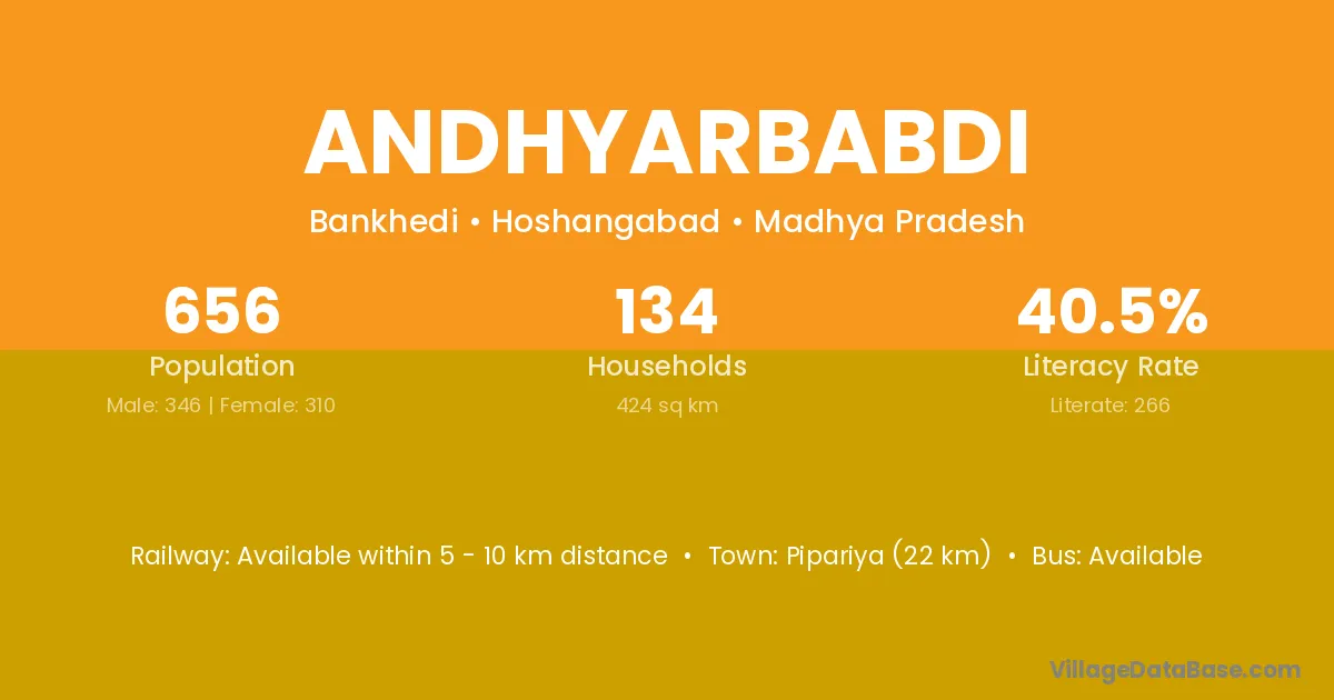 Pipariya (22 km) is the nearest town to Andhyarbabdi village for major economic activities and is located approximately 22 km away.