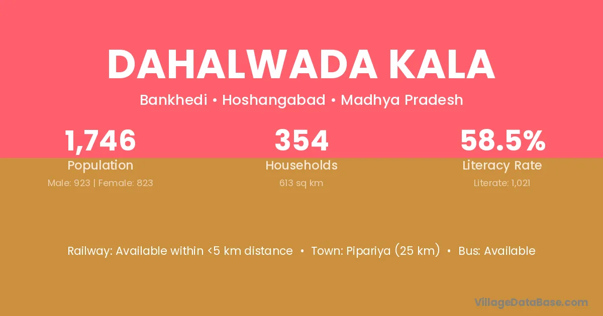 Pipariya (25 km) is the nearest town to Dahalwada Kala village for major economic activities and is located approximately 25 km away.