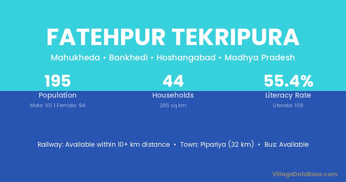 Pipariya (32 km) is the nearest town to Fatehpur Tekripura village for major economic activities and is located approximately 32 km away.