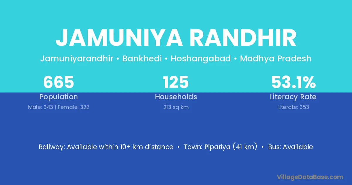 Pipariya (41 km) is the nearest town to Jamuniya Randhir village for major economic activities and is located approximately 41 km away.
