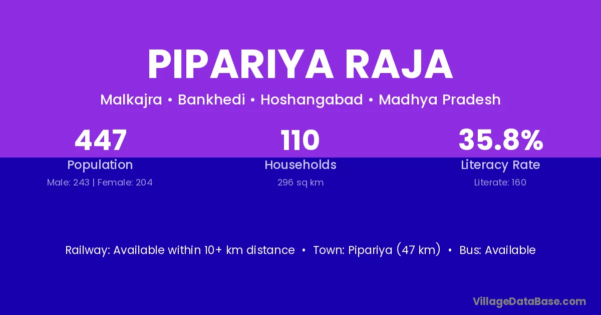 Pipariya (47 km) is the nearest town to Pipariya Raja village for major economic activities and is located approximately 47 km away.