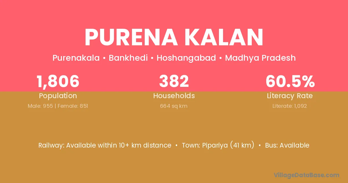 Pipariya (41 km) is the nearest town to Purena Kalan village for major economic activities and is located approximately 41 km away.