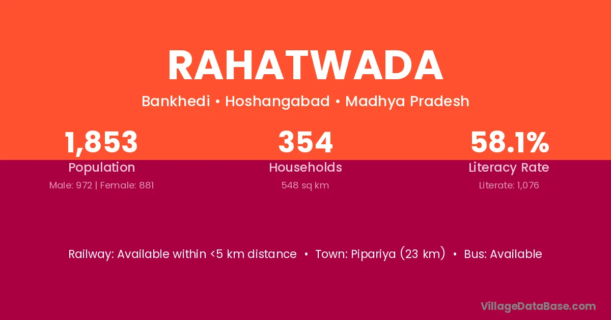 Pipariya (23 km) is the nearest town to Rahatwada village for major economic activities and is located approximately 23 km away.