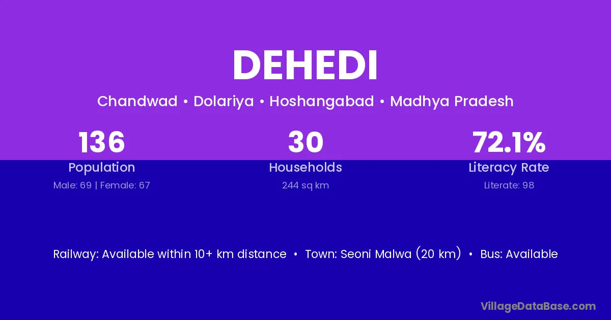 Seoni Malwa (20 km) is the nearest town to Dehedi village for major economic activities and is located approximately 20 km away.