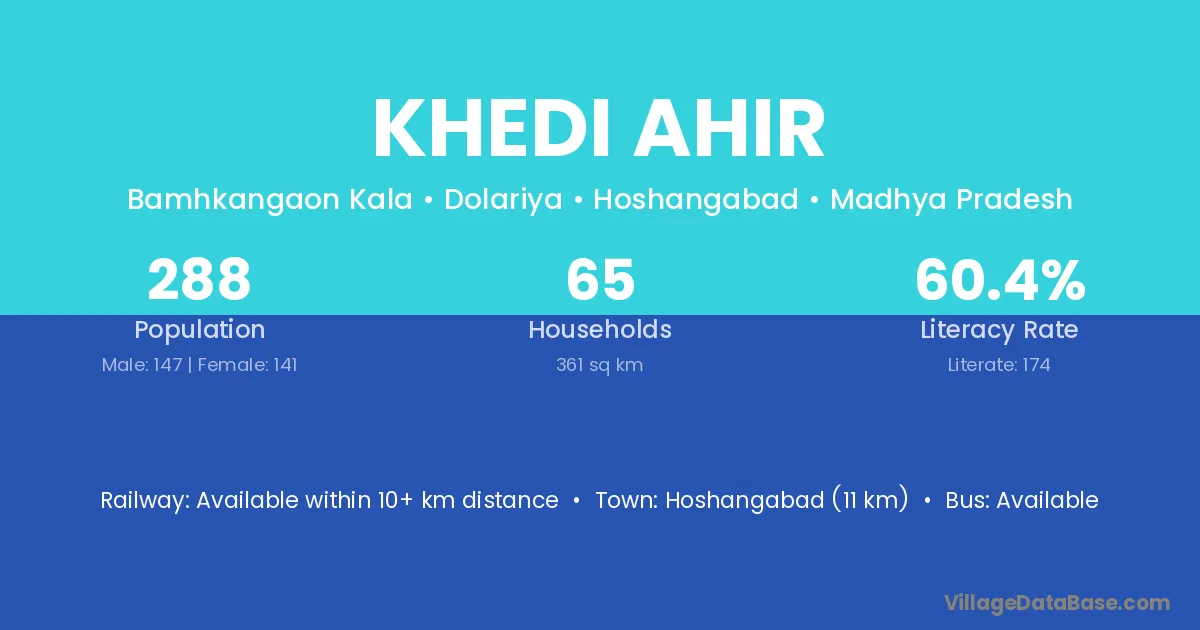 Hoshangabad (11 km) is the nearest town to Khedi Ahir village for major economic activities and is located approximately 11 km away.