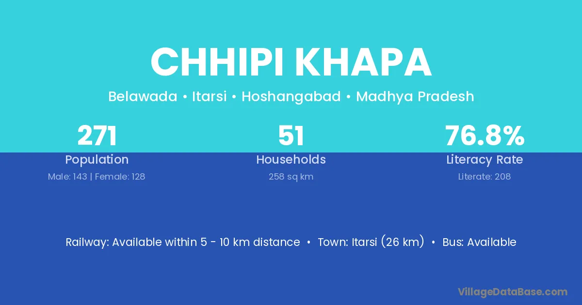 Itarsi (26 km) is the nearest town to Chhipi Khapa village for major economic activities and is located approximately 26 km away.