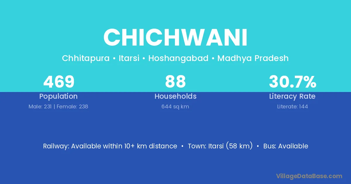 Itarsi (58 km) is the nearest town to Chichwani village for major economic activities and is located approximately 58 km away.
