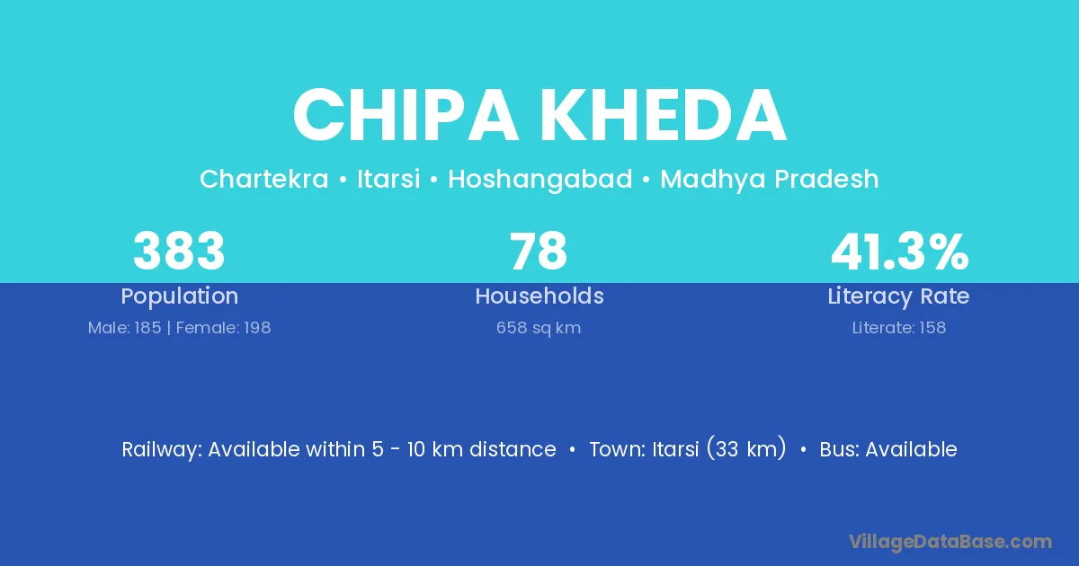 Itarsi (33 km) is the nearest town to Chipa Kheda village for major economic activities and is located approximately 33 km away.
