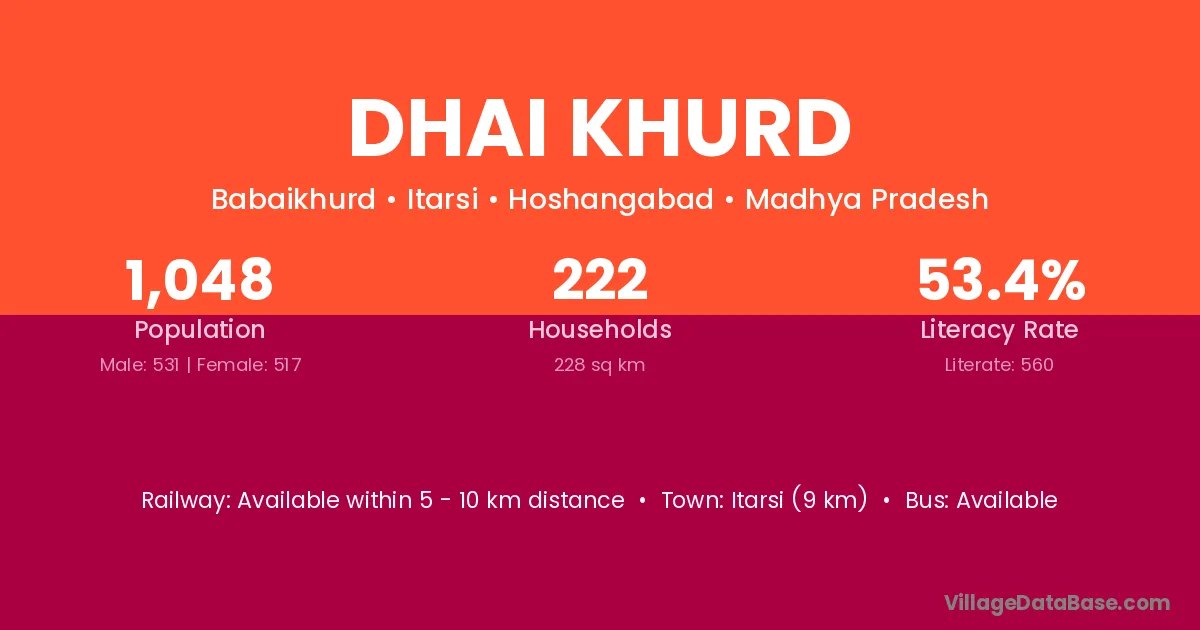 Itarsi (9 km) is the nearest town to Dhai Khurd village for major economic activities and is located approximately 9 km away.